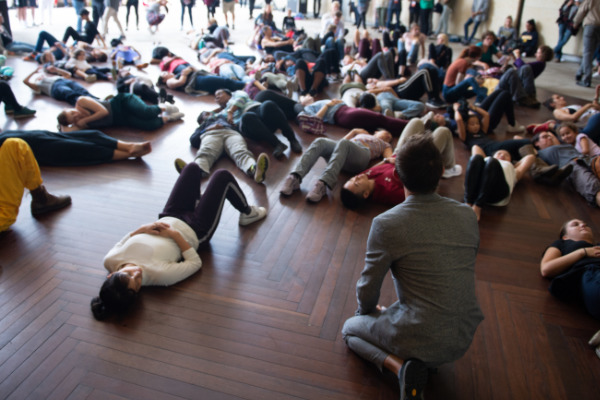 Romain Bigé leads the public in a philosophical warm-up on the Barnes’ West Terrace